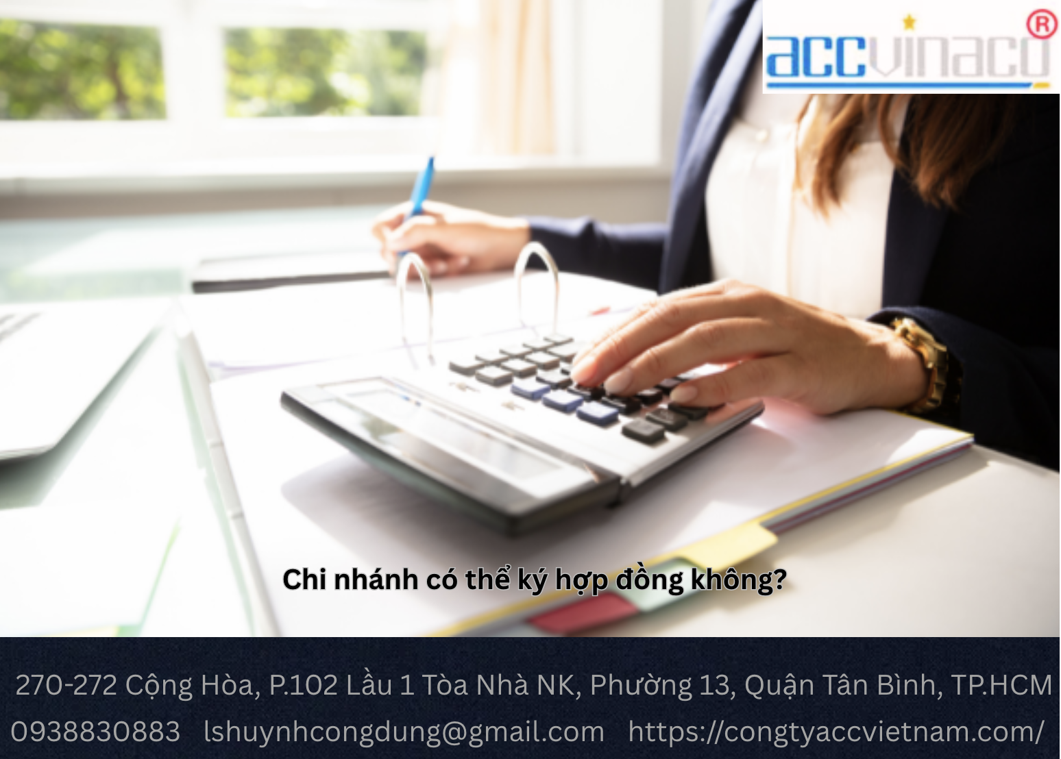 CÔNG TY ACCVINACO là đơn vị tư vấn pháp lý và kế toán uy tín tại TP. Hồ Chí Minh, với hơn 10 năm kinh nghiệm hỗ trợ doanh nghiệp trong thành lập chi nhánh, soạn thảo hợp đồng, và quản lý thuế. Chúng tôi mang đến dịch vụ tư vấn ký hợp đồng cho chi nhánh chuyên nghiệp, hiệu quả, và hợp pháp.