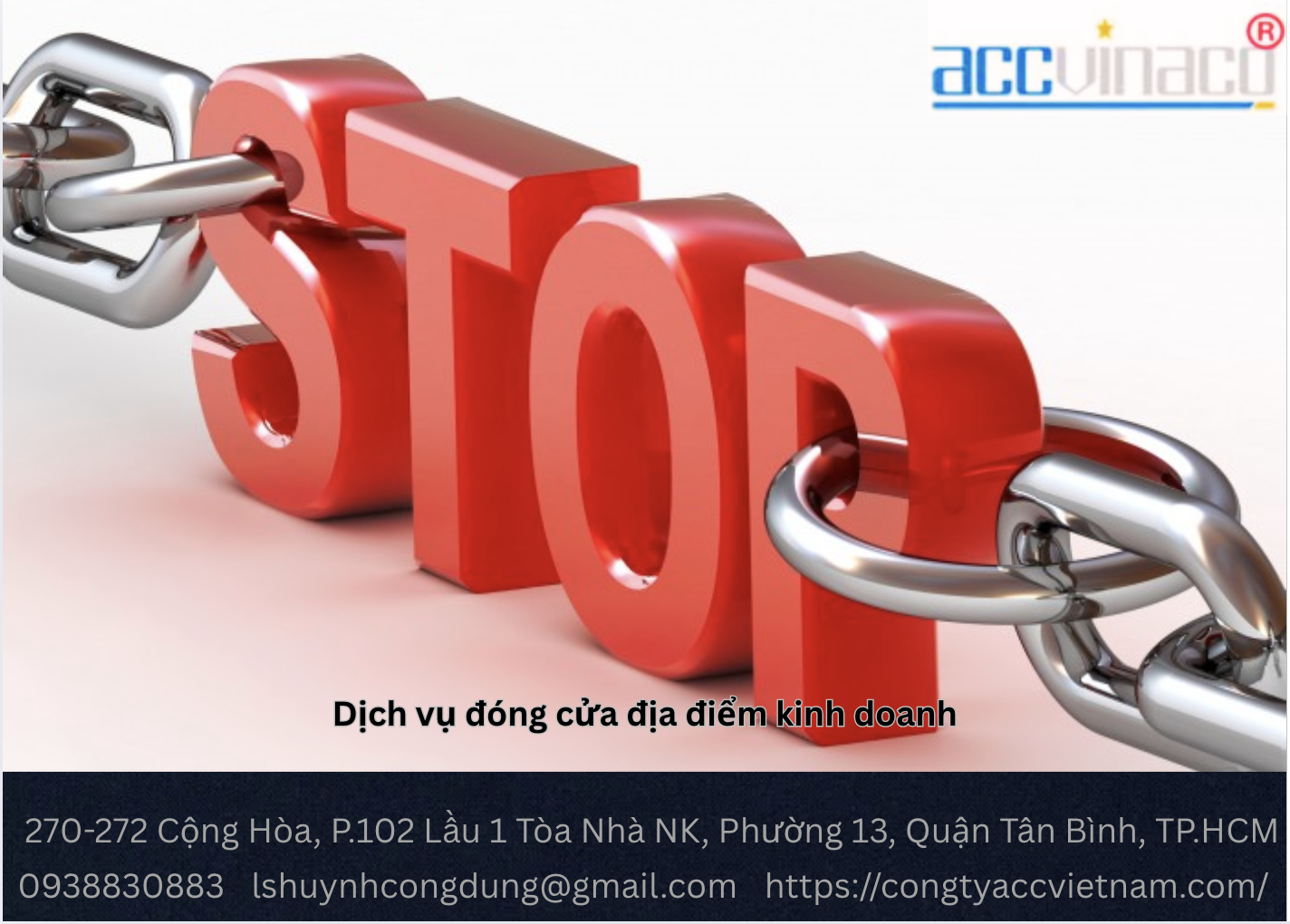 CÔNG TY ACCVINACO hỗ trợ doanh nghiệp đóng cửa địa điểm kinh doanh nhanh chóng, hợp pháp. Nếu bạn cần tư vấn thành lập công ty mới, hãy tham khảo dịch vụ thành lập công ty.